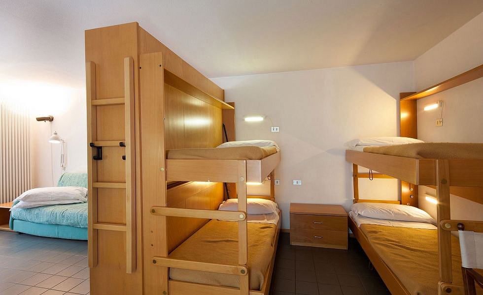106 m² - 1. piętro apartamentu - 1 sypialnia z 3 szafowymi łóżkami piętrowymi, balkon; 2 piętro apartamentu - pokój dzienny z aneksem kuchennym i rozkładaną kanapą dla 2 osób, łazienka, balkon; 3. piętro apartamentu - 2 sypialnie z łóżkiem małżeńskim, 1 sypialnia z 1 lub 2 łóżkami pojedynczymi (na poddaszu), łazienka z wanną, balkon