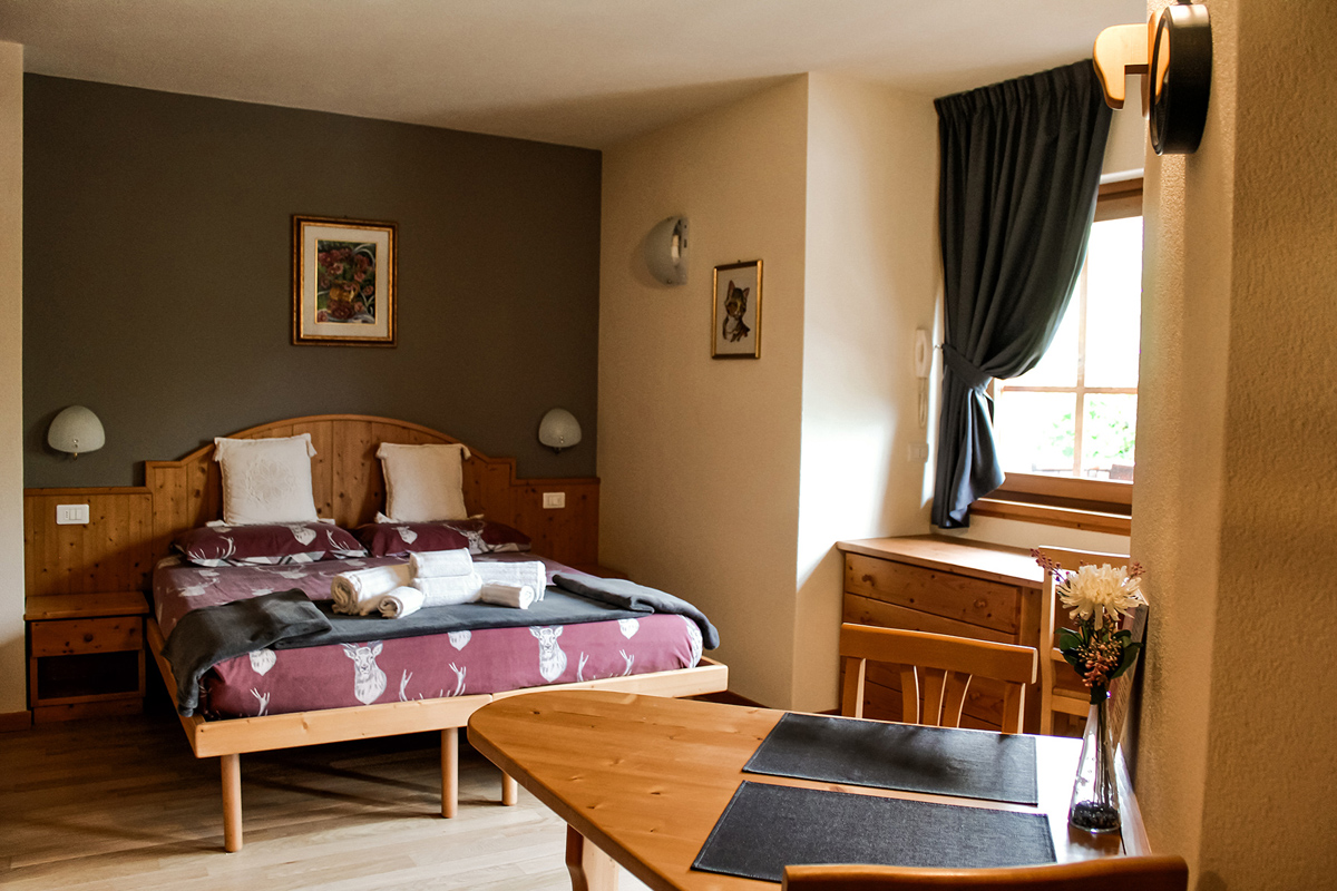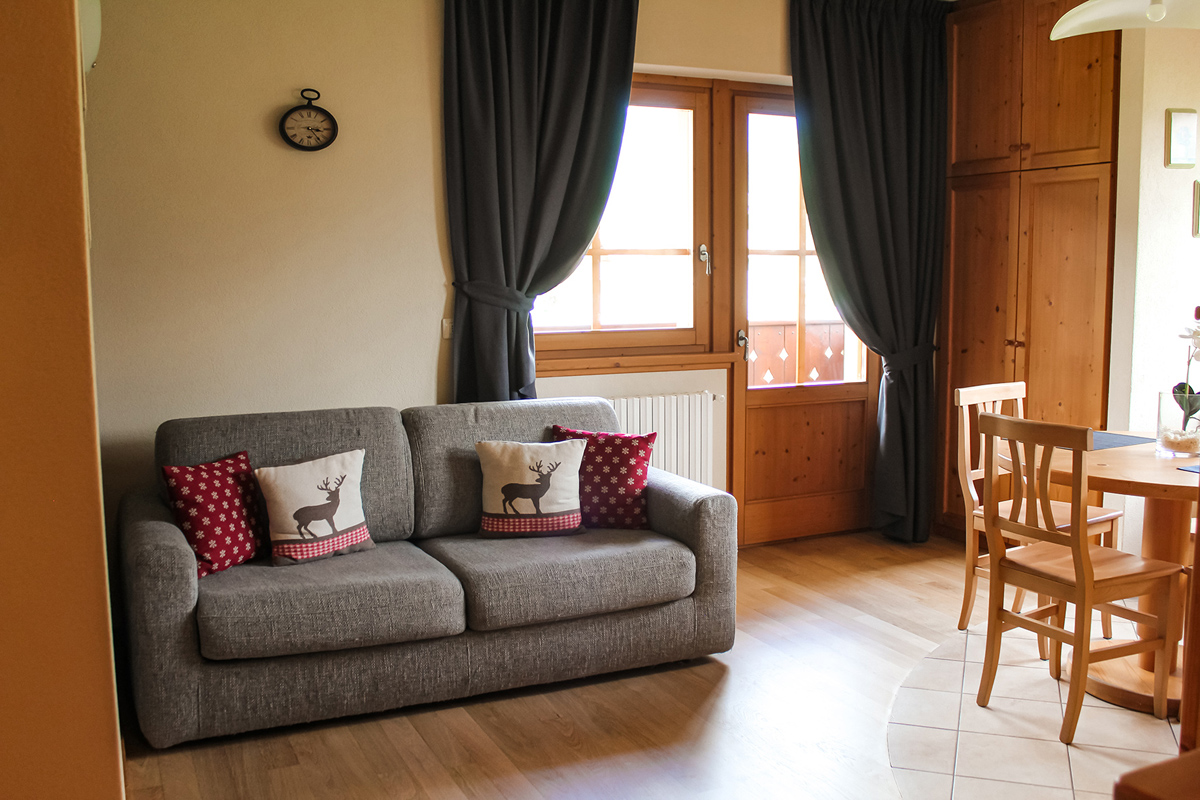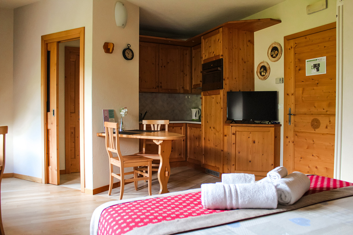 42 m² - 1 sypialnia z łóżkiem małżeńskim, salon z aneksem kuchennym i rozkładaną sofą dla 2 osób, łazienka z prysznicem, balkon; jeden apartament jest mniejszy i posiada kuchnię na podwyższeniu, do której można wejść po schodach