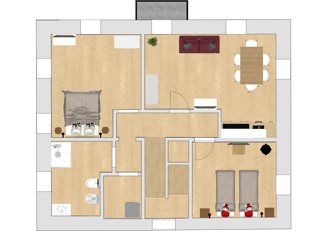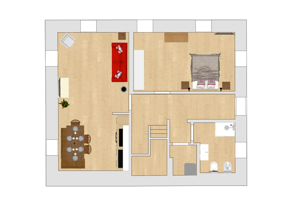 73 m² - parter: 1 sypialnia z łóżkiem małżeńskim, 1 sypialnia z łóżkiem piętrowym, łazienka, balkon; 2 piętro: salon z aneksem kuchennym i rozkładaną sofą dla 2 osób, łazienka