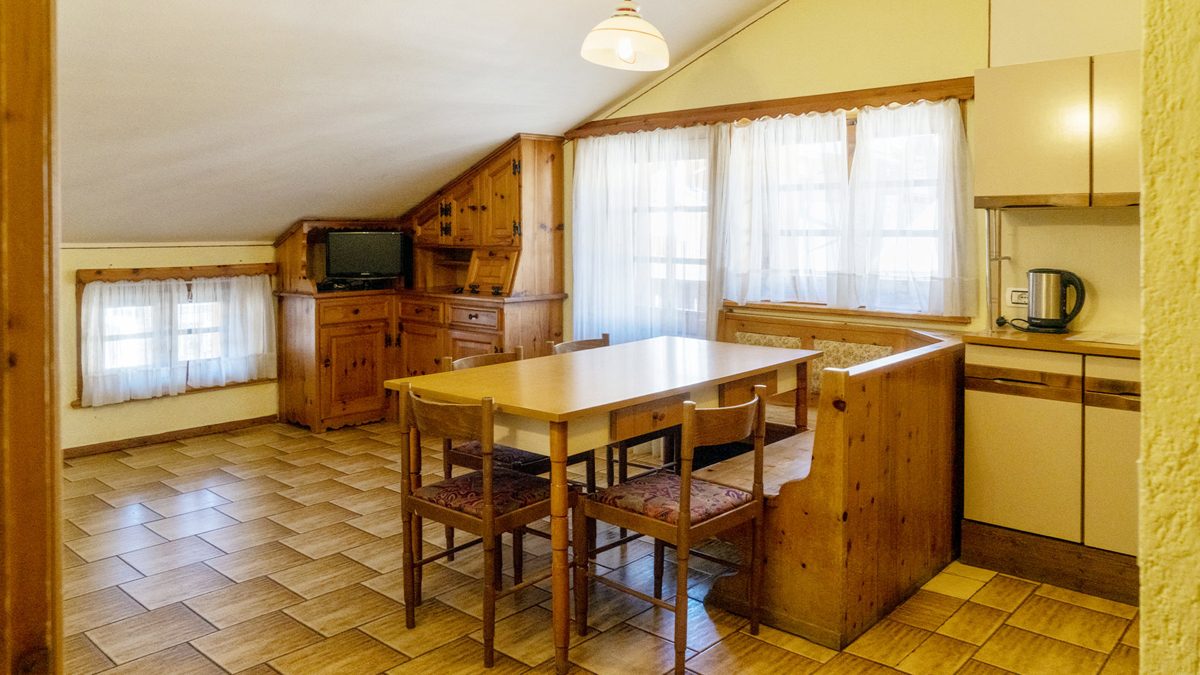 trilo 4 - 1 sypialnia z łóżkiem małżeńskim lub 2 pojedynczymi łóżkami i balkonem, 1 sypialnia z 2 pojedynczymi łóżkami (możliwość połączenia), pokój dzienny z aneksem kuchennym, łazienka z prysznicem; apartament znajduje się na poddaszu
