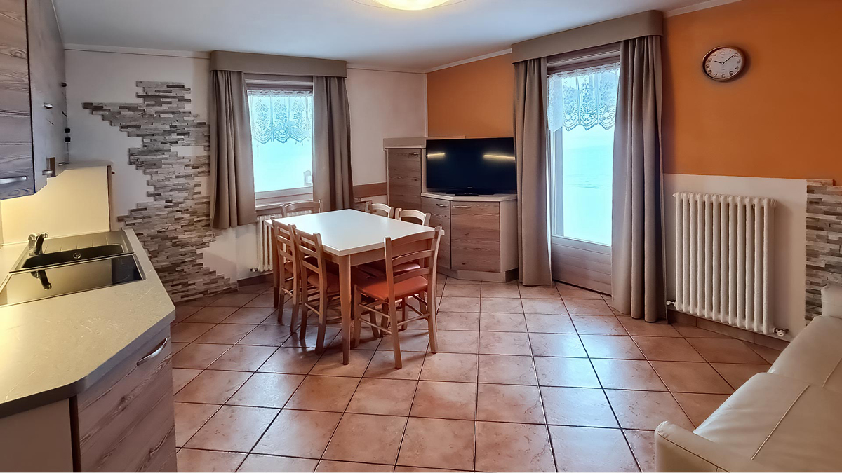 1 sypialnia z łóżkiem małżeńskim lub 2 pojedynczymi łóżkami, 1 sypialnia z 3 pojedynczymi łóżkami, pokój dzienny z aneksem kuchennym, łazienka z prysznicem; apartament znajduje się na parterze