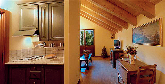 18 m² - pokój dzienny z aneksem kuchennym, łóżkiem małżeńskim i 1 pojedyńczym łóżkiem lub 3 pojedyńczym łóżkiem, łazienka, balkon lub wyjści ena ogród