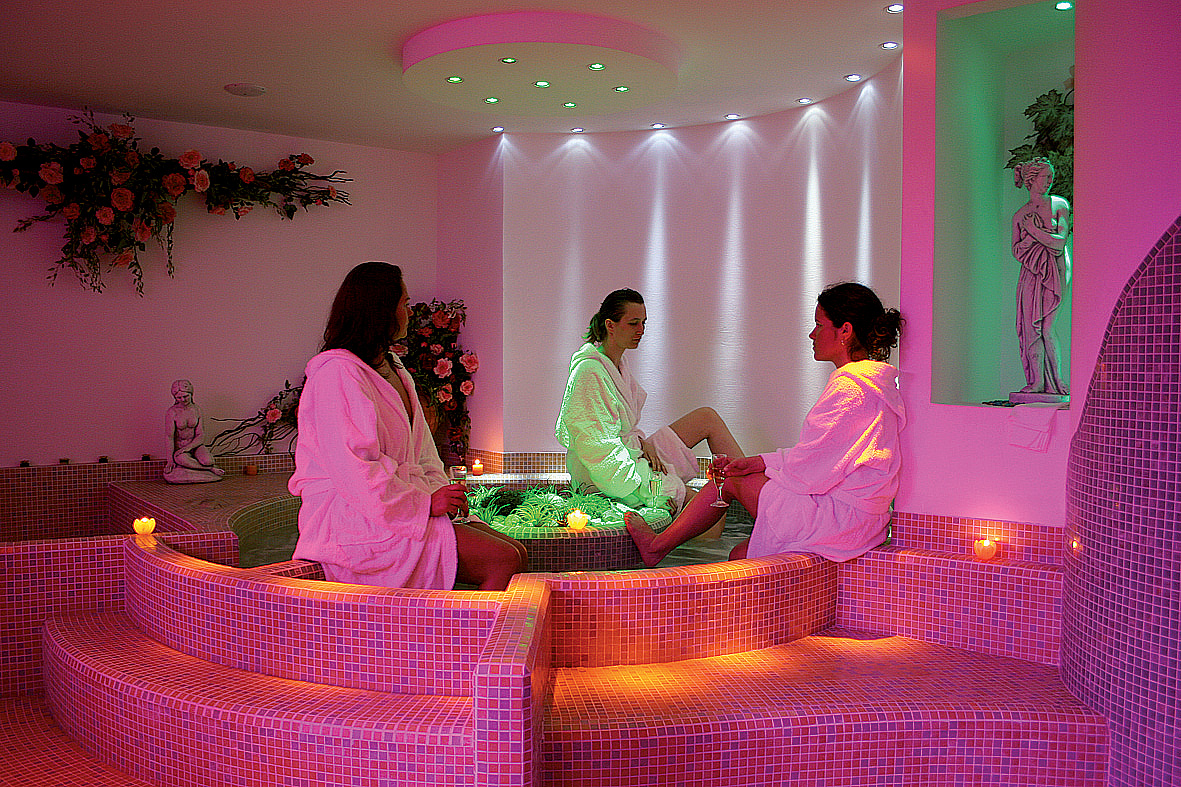basen 8 x 6 m z minibasenem, basenem dla dzieci i jacuzzi do 8 osób, sauna#, biosauna# sauna parowa#, mgła lodowa#, wielofunkcyjny prysznic#, solarium#*, kącik relaksacyjny# z leżakami, ścieżka Kneippa#, mała siłownia#, kąpiel sienna*, masaże*, usługi kosmetyczne*, tenis stołowy; z usług oznaczonych # nie mogą korzystać dzieci do lat 16 obowiązkowa opłata za wypożyczenie ręcznika 5 € / za zmianę