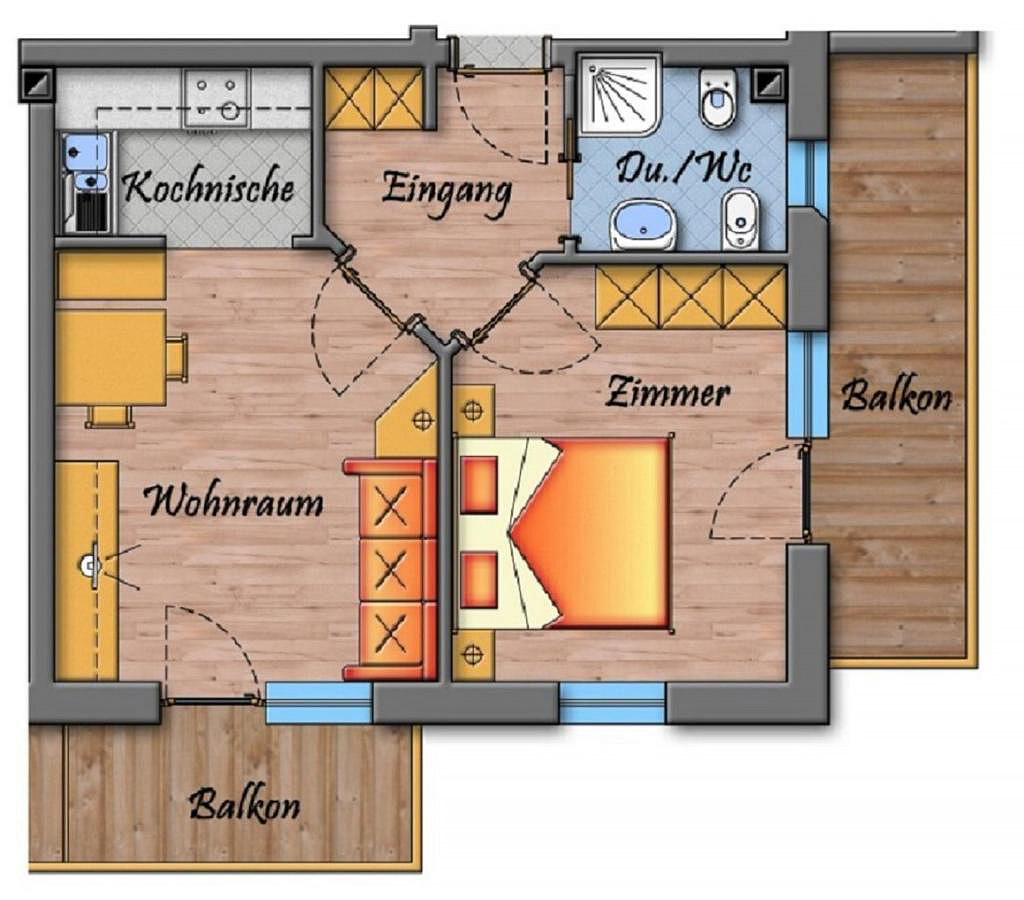 46 m² - 1 sypialnia z łóżkiem małżeńskim, sypialnia z 2 łóżkami pojedynczymi, pokój dzienny z aneksem kuchennym, łazienka, balkon