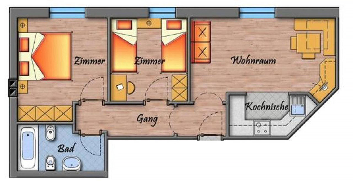 56 m² - 1 sypialnia z łóżkiem małżeńskim, sypialnia z 2 łóżkami pojedynczymi, salon z aneksem kuchennym i rozkładaną sofą dla 2 osób, łazienka z wanną, balkon