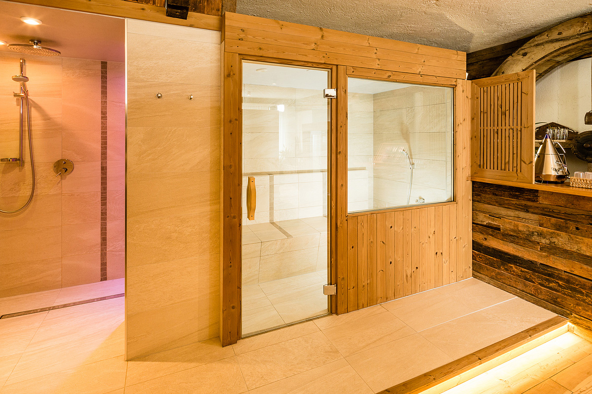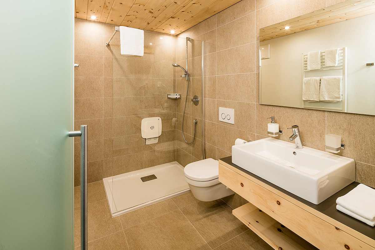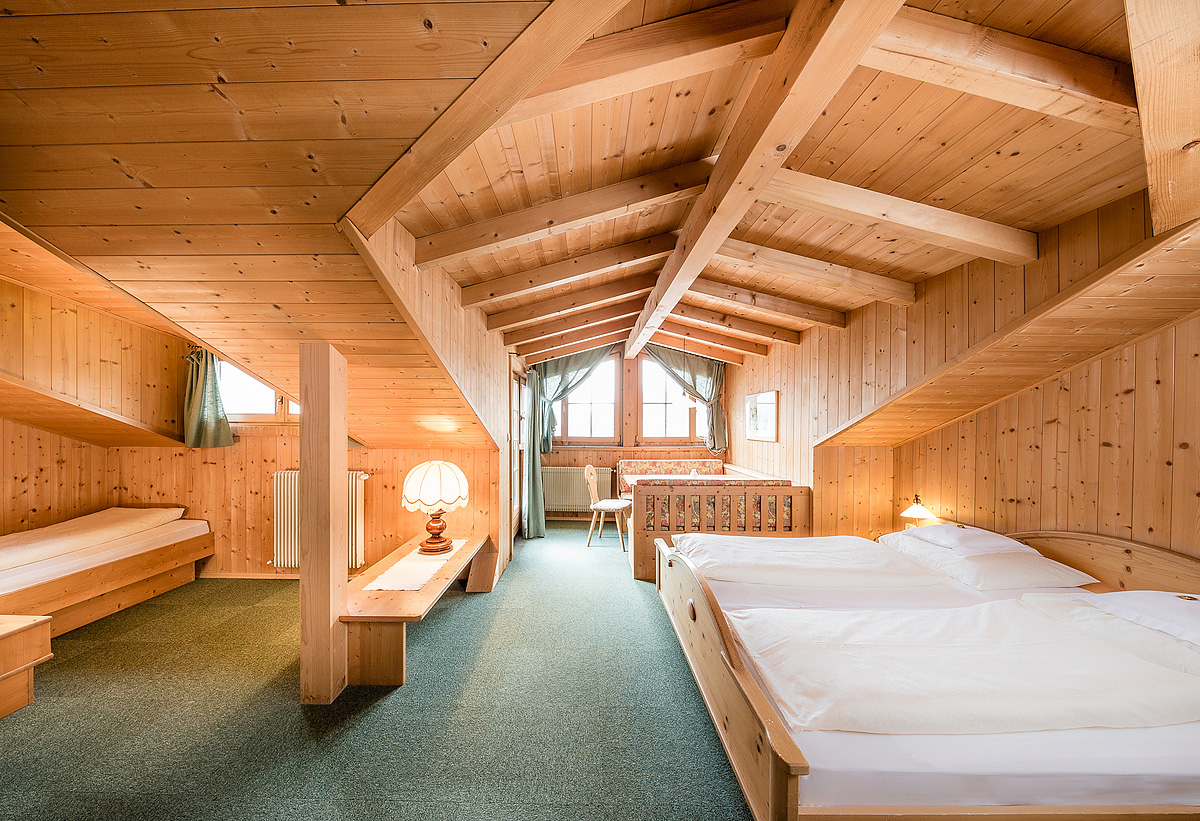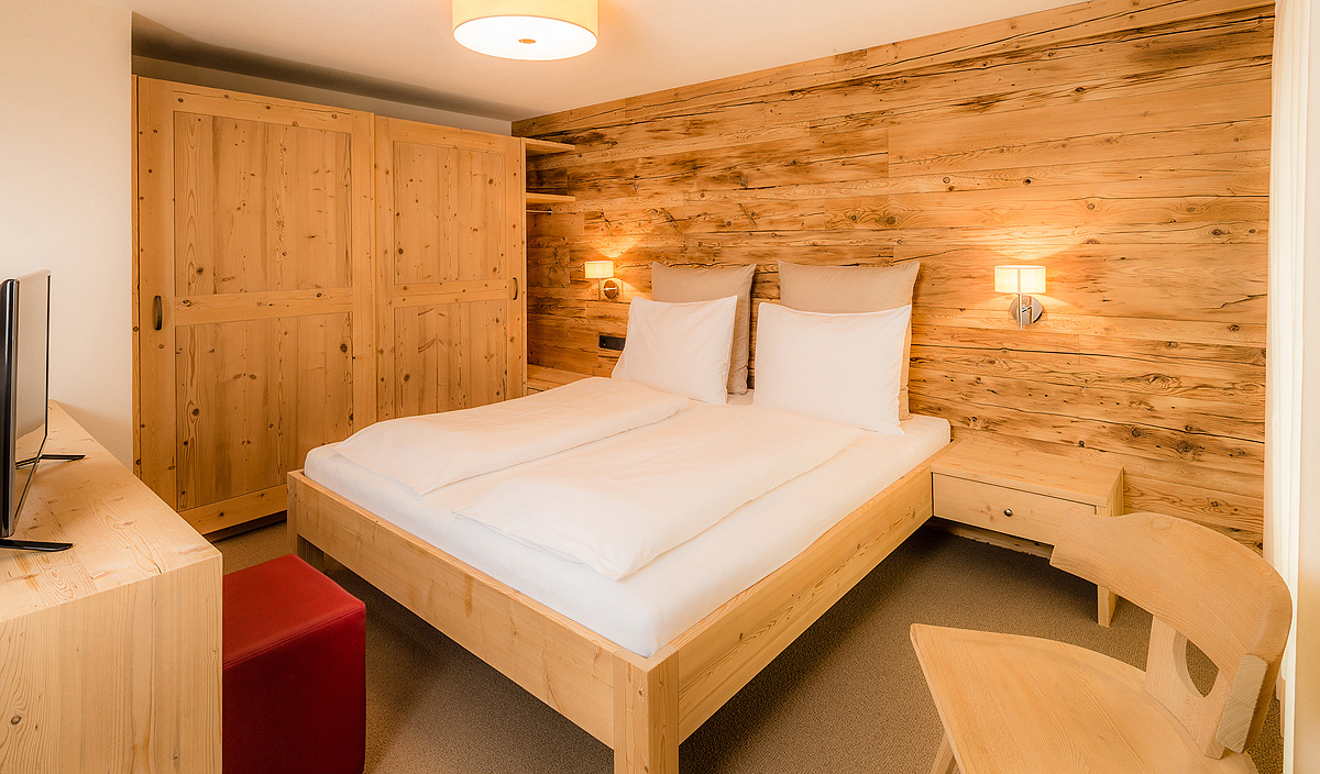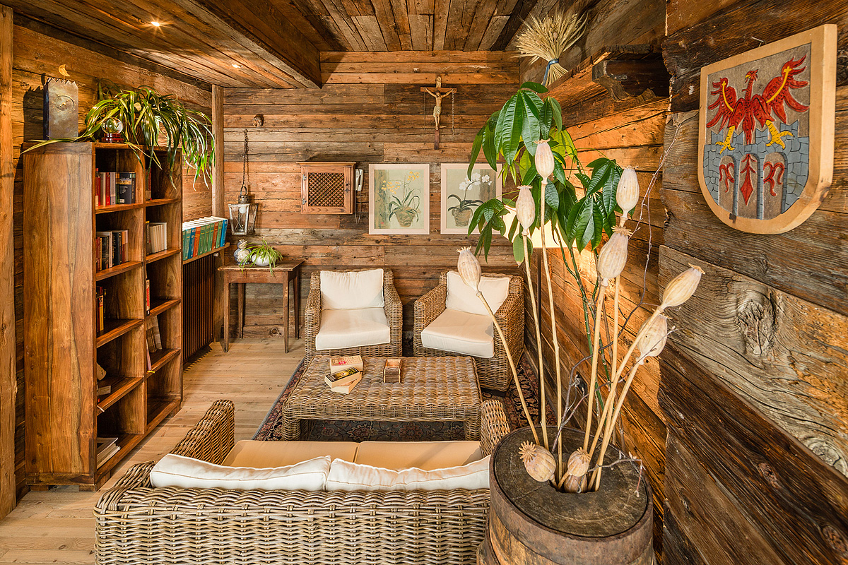 rodzinny hotel w stylu Południowego Tyrolu, wykonany z naturalnych materiałów i oferujący piękne widoki na góry
