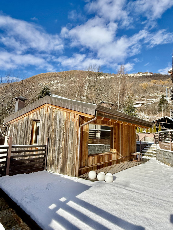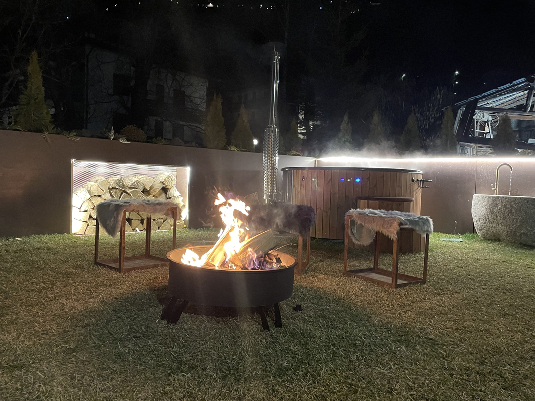 wanna z hydromasażem w pomieszczeniu* dla maksymalnie 4 osób, wanna z hydromasażem na zewnątrz* dla 2 osób, sauna na zewnątrz*, strefa relaksu w pomieszczeniu* z leżakami i herbatami ziołowymi, strefa relaksu na zewnątrz* z leżakami, ścieżka Kneippa*, przebieralnia z łazienką*