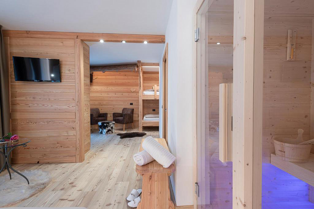 Family 3+1 - pokój z łóżkiem małżeńskim i ewentualnie rozkładaną kanapą, łóżkiem piętrowym lub 1 lub 2 stałymi łóżkami dla 1 osoby dorosłej i 1 dziecka do nieukończonych 12 lat, łazienka, balkon; minimalne obłożenie to 4 osoby; pokoje mogą być dwupoziomowe