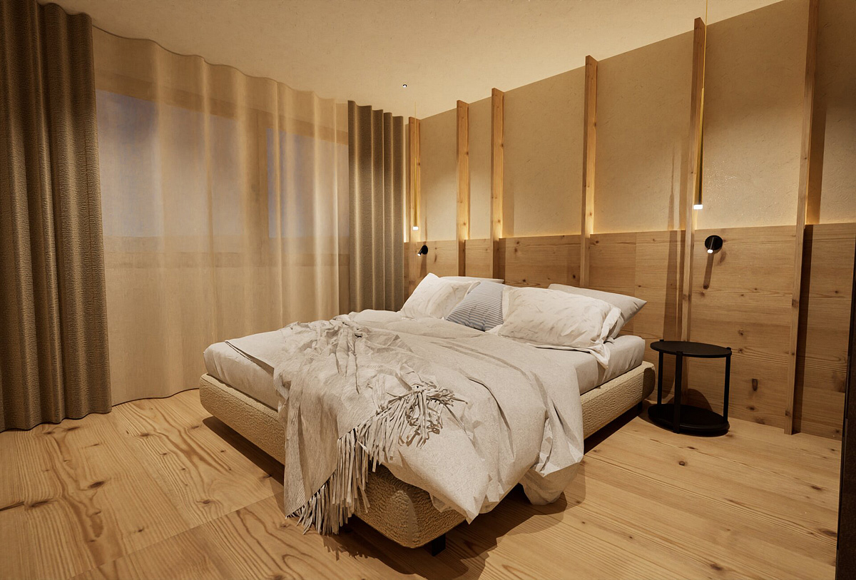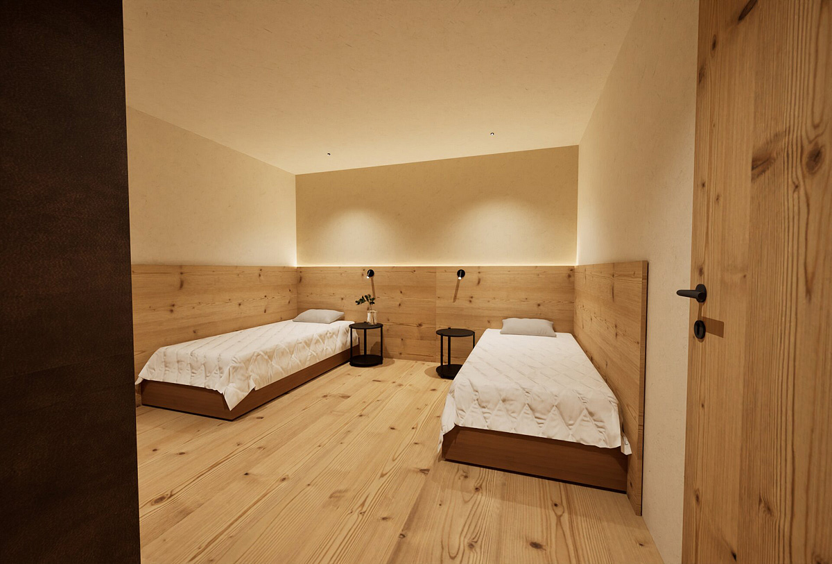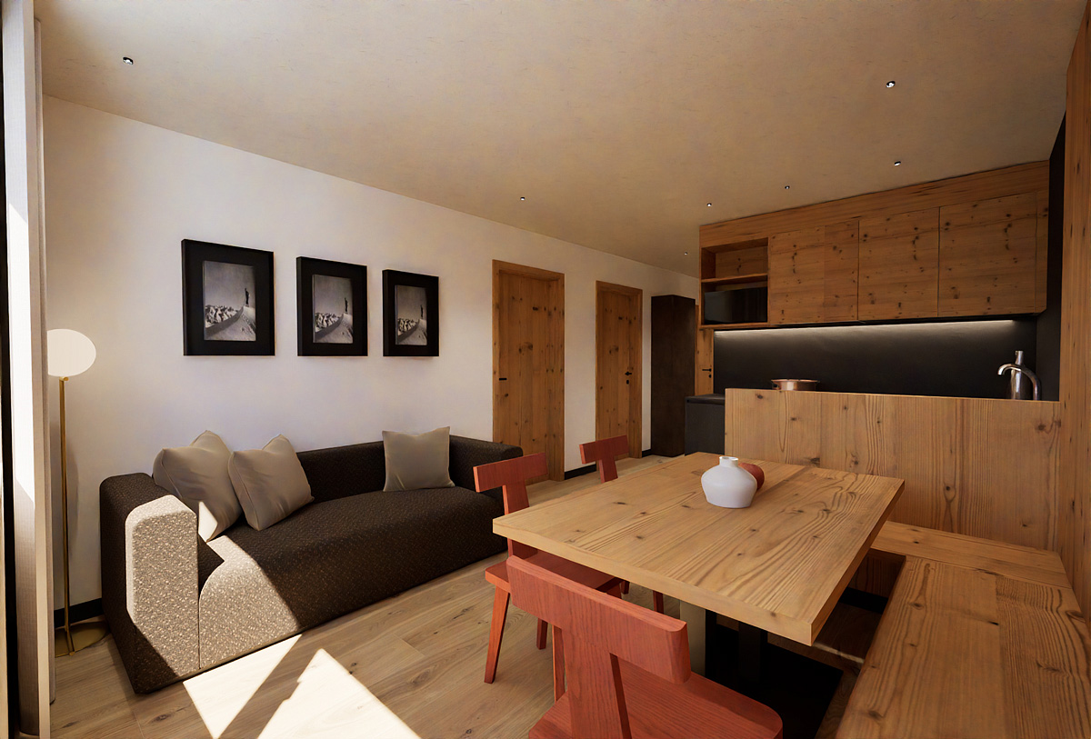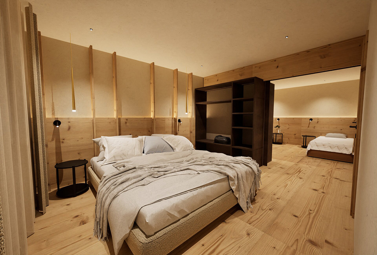 55 m² - 1 sypialnia z łóżkiem małżeńskim, 1 sypialnia bez okna oddzielona od sypialni małżeńskiej przesuwaną ścianą z 2 pojedynczymi łóżkami i osobnym wejściem, salon z aneksem kuchennym i rozkładaną sofą dla 2 osób, łazienka częściowo w pomieszczeniu, balkon z panoramicznym widokiem na góry
