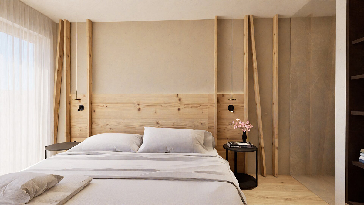 60 m² - 1 sypialnia z łóżkiem małżeńskim, 1 sypialnia bez okna oddzielona od sypialni małżeńskiej przesuwaną ścianą z 2 pojedynczymi łóżkami i osobnym wejściem, salon z aneksem kuchennym i rozkładaną sofą dla 2 osób, łazienka częściowo w pomieszczeniu, drugi prysznic w sypialni małżeńskiej, balkon