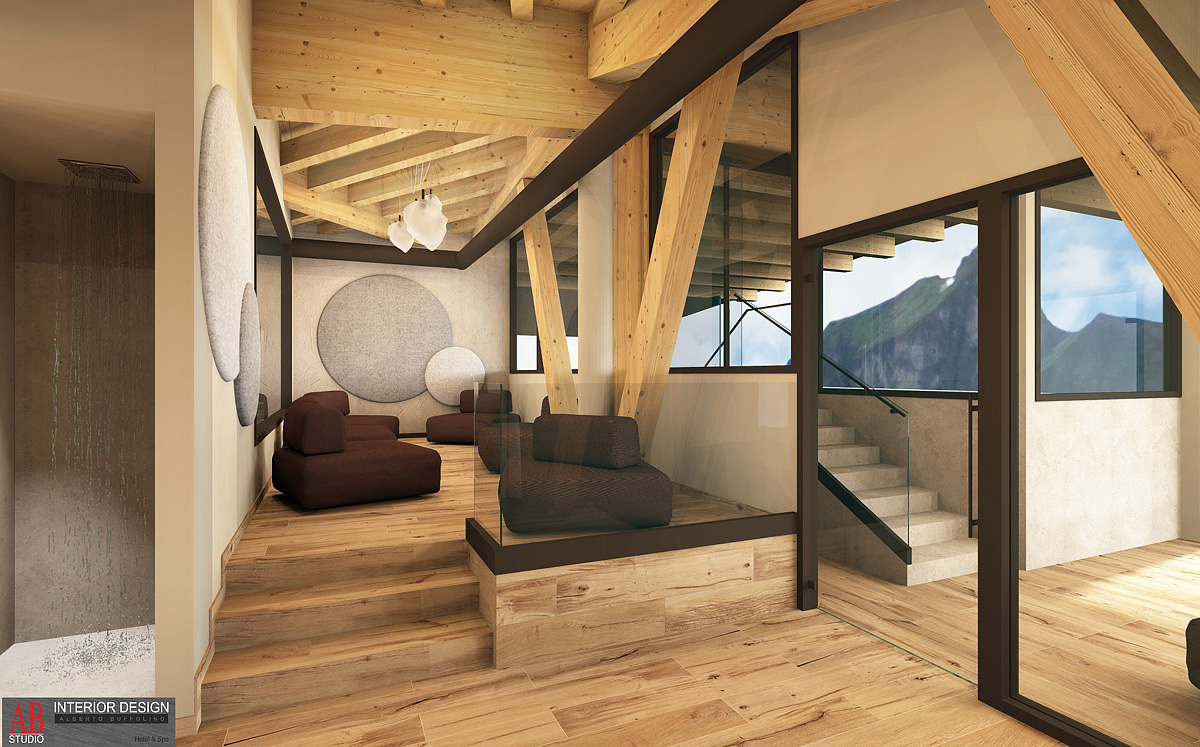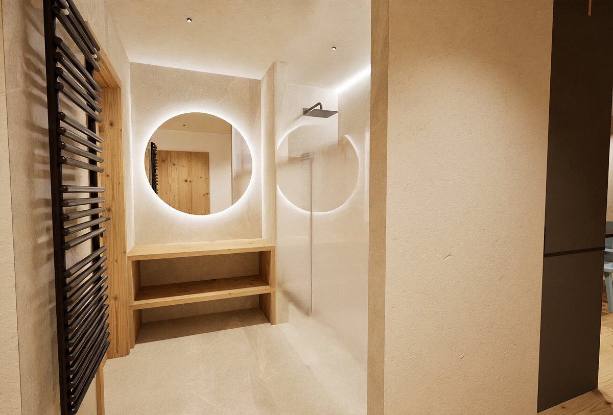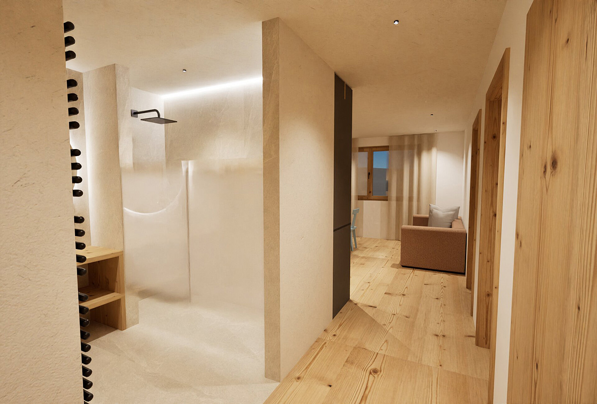 52 m² - 1 sypialnia z łóżkiem małżeńskim i wolnostojącą wanną, salon z aneksem kuchennym i rozkładaną sofą dla 2 osób, pokój relaksacyjny z sauną, częściowo wewnętrzna łazienka, balkon z widokiem panoramicznym