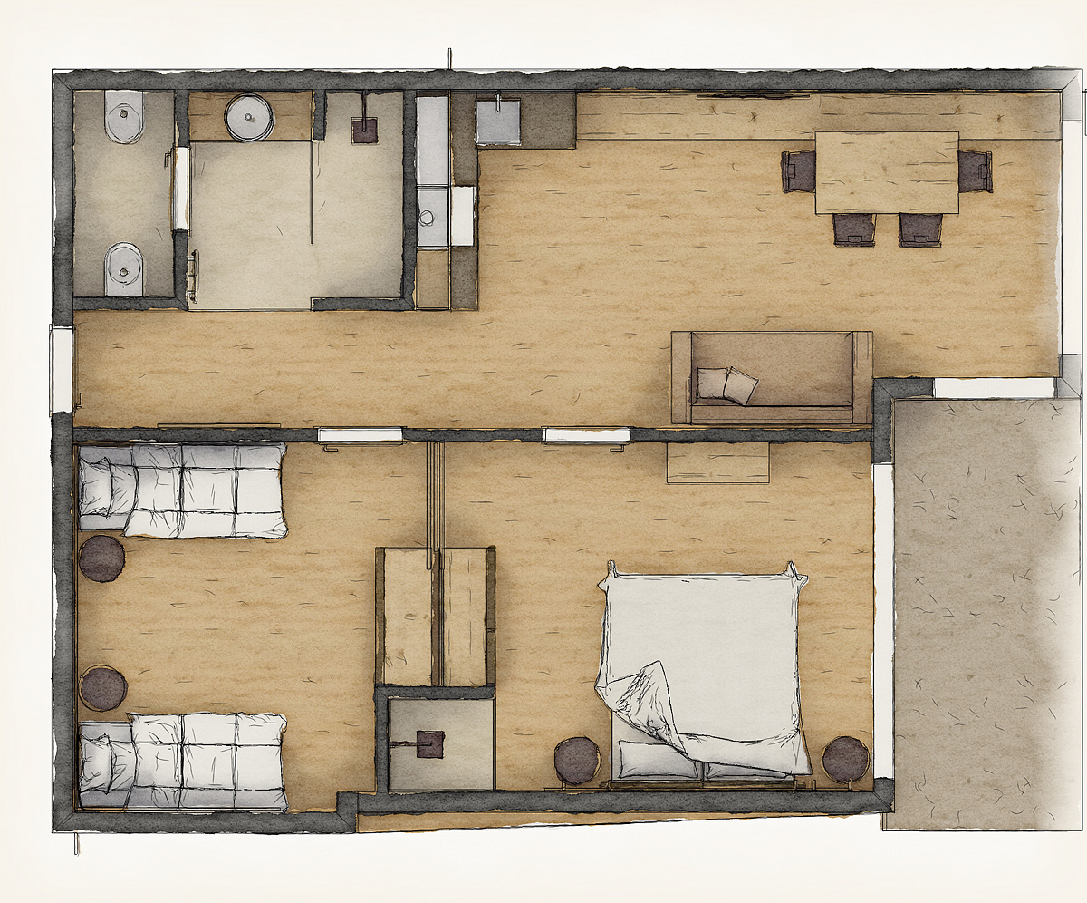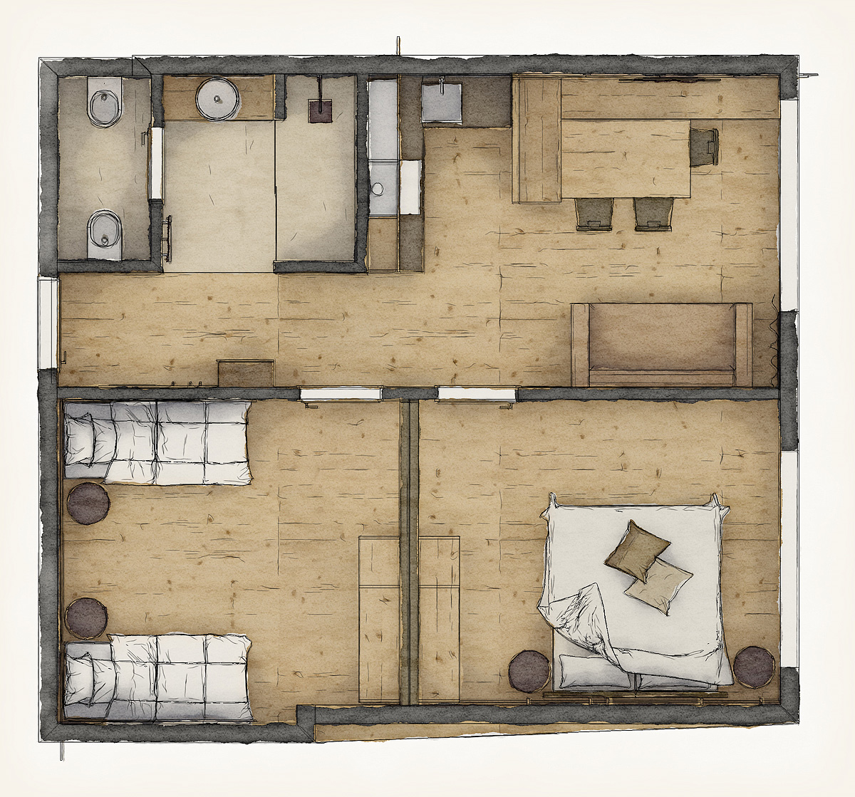 52 m² - 1 sypialnia z łóżkiem małżeńskim, 1 sypialnia bez okna oddzielona od sypialni małżeńskiej przesuwaną ścianą z 2 pojedynczymi łóżkami i osobnym wejściem, salon z aneksem kuchennym i rozkładaną sofą dla 2 osób, łazienka częściowo w pomieszczeniu
