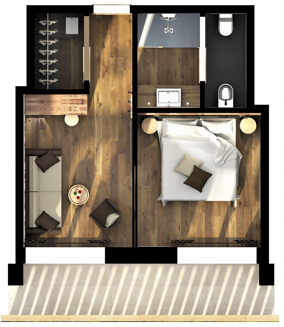 28 m² - pokój z łóżkiem małżeńskim i ewentualnie rozkładaną kanapą dla 1 lub 2 osób, łazienka, balkon; pokoje mogą być tylko częściowo oddzielone ścianą