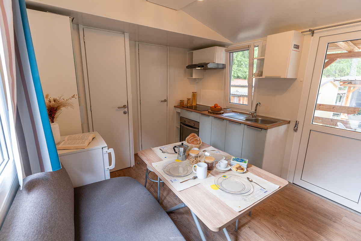 Są to niezależnie ogrzewane i izolowane domki mobilne, każdy z własną łazienką; znajdują się w pobliżu centralnego budynku kempingu, gdzie również znajdują się wymienione poniżej udogodnienia.